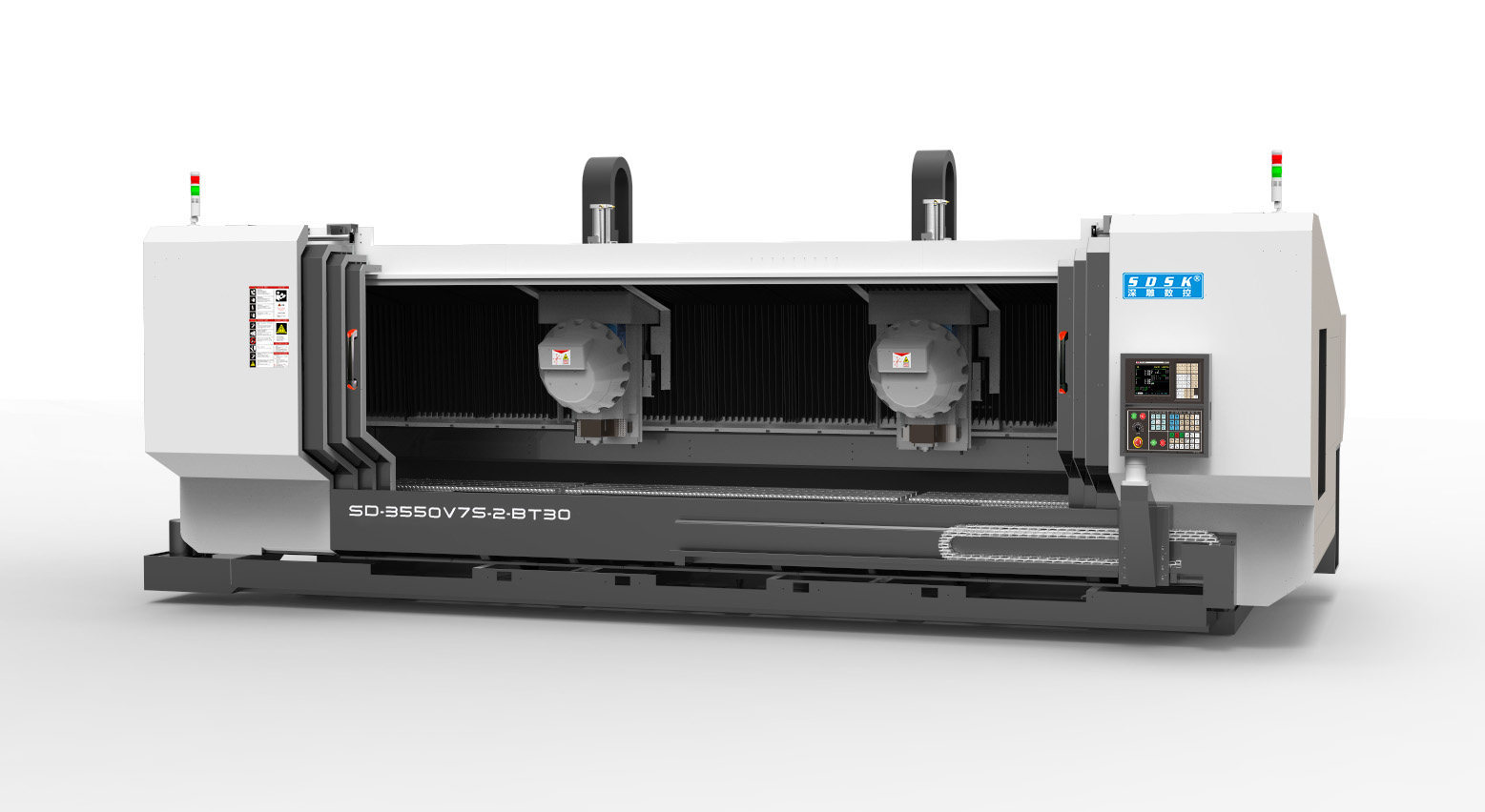 1. The SD3550V7S-2-BT30 model series is a large-scale high-speed dual head dual channel profile machining center specially designed for customers; Equivalent to two machines using one set of CNC system and one set of bed; It can process two different workpieces simultaneously or process the same workpiece in segments with both ends simultaneously; The 2Y axis head can move forward and backward simultaneously or independently, the 2X axis head can move left and right simultaneously or independently, and the 2Z axis spindle can move up and down simultaneously or independently. When processing batch products, both ends can be used to process the products simultaneously, or the X1 axis can be moved to the left side of the machine to process long stroke workpieces separately using the X2 axis, achieving a dual-use function< Br/>