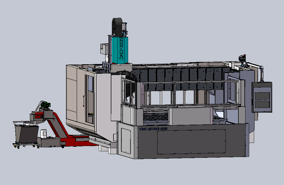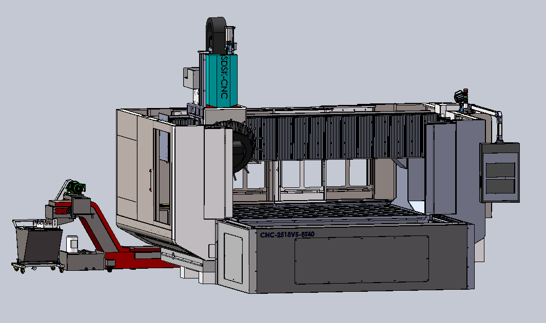 1、SDSK2518V5-BT40機型是專門為客戶量身定做的輕型2.5米龍門加工中心;定梁式結(jié)構(gòu);配有臺灣圣杰16位飛碟式刀庫,換刀速度為2秒;運動方式為Y軸工作臺前后移動,X軸左右移動,Z軸上下移動。